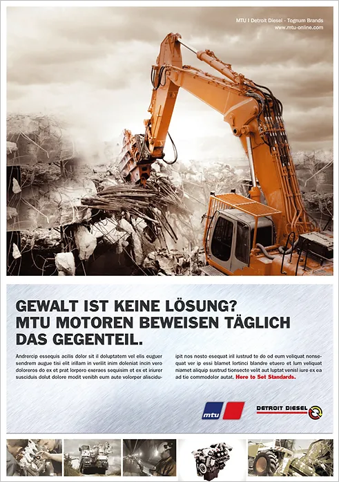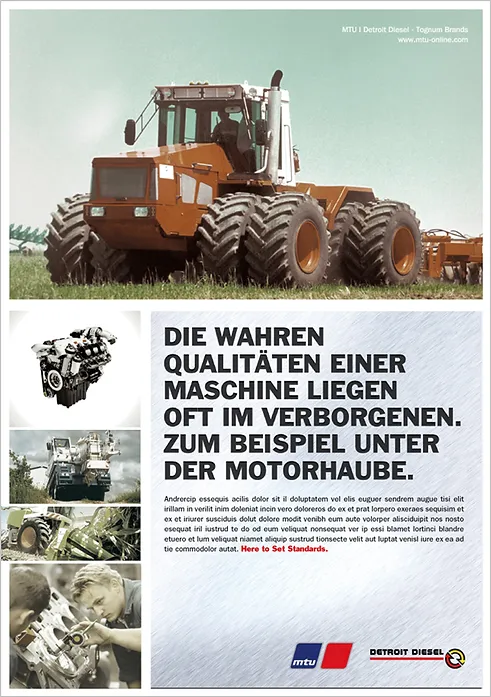 Unsere Aufgabe war es, die Marke MTU über das technisch-faktische Image hinaus zu entwickeln und eine stärkere emotionale Verbindung zu den Kunden aufzubauen. Dies erreichten wir, indem wir die Kraft der MTU-Motoren dramatisch in Bild und Text darstellten. Unser Ansatz bestand darin, ein fesselndes Markenerlebnis zu schaffen, das über die reine Produktpräsentation hinausging. Wir setzten auf hochwertige visuelle Darstellungen, die die Leistungsfähigkeit und Zuverlässigkeit der Motoren unterstrichen, gepaart mit einer kraftvollen und ansprechenden Textgestaltung. Dadurch gelang es uns, nicht nur die technischen Aspekte, sondern auch die emotionale Faszination und die Bedeutung der Motoren für die Kunden hervorzuheben